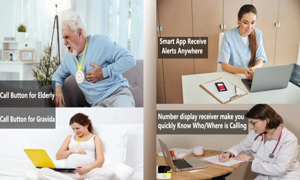 - Nėra atstumo apribojimų: Šis pažangus slaugos pranešimų gaviklis papildo tradicinius pranešimų gaviklius naujomis funkcijomis, prisijungdamas prie „Wi-Fi“, siųsdamas belaidžius signalus į jūsų mobilųjį telefoną, leisdžia priimti signalus bet kada ir bet kur.