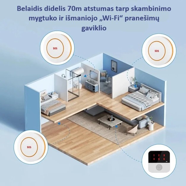 - Nereikia nieko mokėti: Prisijunkite prie to paties „Wi-Fi“, pridėkite skambinimo mygtuką prie programėlės savo telefone, paspauskite SOS mygtuką ir jūsų mobilioji programėlė gaus pranešimą.